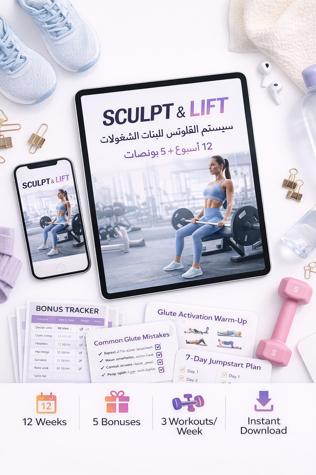 برنامج تدريبي واضح ومدروس لمدة 12 أسبوع مصمّم للبنات المشغولات: 3 حصص بالأسبوع / 45 دقيقة — يركّز على تكبير القلوتس بأسلوب ذكي مع تتبّع تقدّم وبونصات تساعدك تلتزمين وتستمرّين.